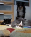 Теперь мы имеем четырех симпатичных котят. Они все так же очень юные, но уже быстро бегают, высоко лазают (в основном по штанам мамы-кормилицы), уверенно поедают сухой корм для котят, уже освоили лоток с наполнителем (как стали сами ходить в туалет, так за один день и освоили - фантастика