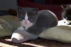 Дымна-сан. Она же Мыша, она же Элис (Купер). Самая крупная, полностью голубая. Характер волевой, стойкий, всегда добивается своего. Единственная из малявок при встрече с собакой воспитательницей зашипела. Первая стала есть из блюдца, первая поняла, для чего лоток.
