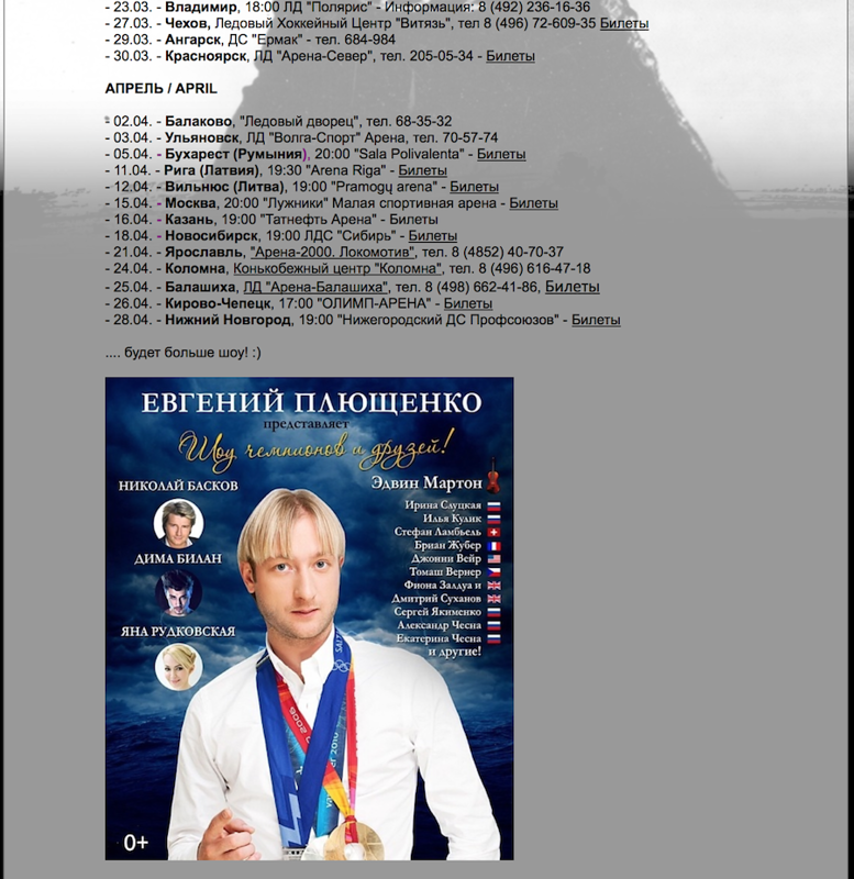 • да молодцы они, конечно. Спортсмены - это адский труд, терпение, воля, кто бы спорил, глубочайший респект им за это)) Но знаешь, для меня сейчас Плющенко в один ряд с Пугачевой встал, та тоже, уважаемая и заслуженная, каждый год прощальный концерт, а голоса нет уже лет так 15-20)))