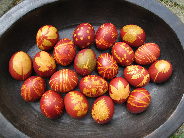 Одним полотенцем, на куски порванным и смоченным в уксусе, обматываем яйца перед окрашиванием. Как окрасятся - снимаем и выкидываем. Вторым полотенцем, обмакнутым в растительное масло, смазываем уже окрашенные яйца, чтобы блестели. Потом его тоже выкидываем.