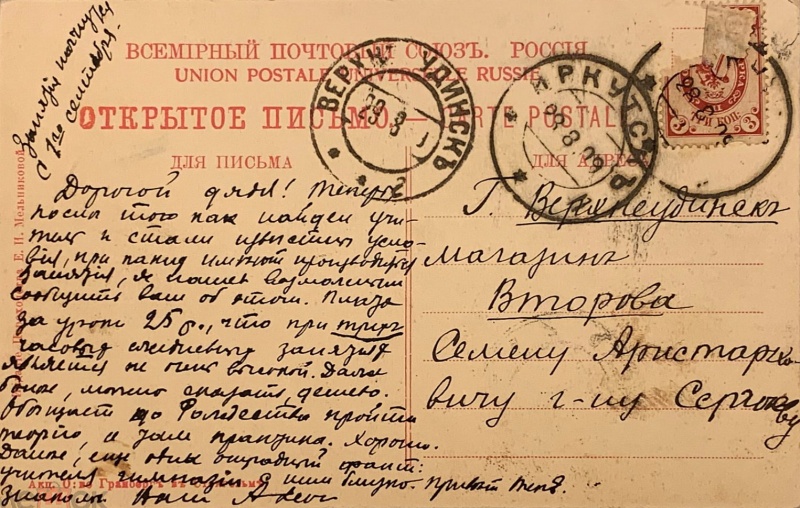 Теперь, после того как найден учитель и стали известны условия, при каких имеют производится занятия, я нашёл возможность сообщить вам об этом. Плата за уроки 25р., что при трёхчасовых ежедневных занятиях является не очень высокой. Даже более, можно сказать дёшево. Обещает до Рождества пройти теорию, а далее практика. Хорошо. Далее, ещё один отрадный факт: учитель гимназии с ним(?) близко. Привет тёте. Знаком.(?) Ваш А.