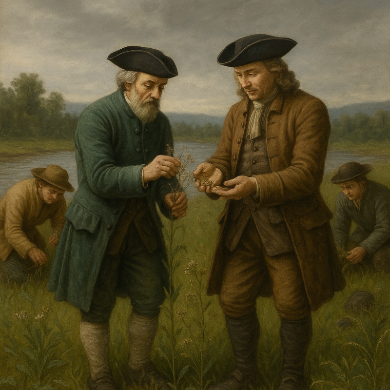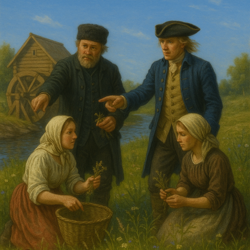 рисунок: доктор Мессершмидт и капитан Табберт дают указания двум девушкам-крестьянкам семена каких растений нужно собрать. Дело происходит недалеко от водяной мельницы на Черной речке – ее видно на заднем фоне. Ветер восточный. Солнечно.