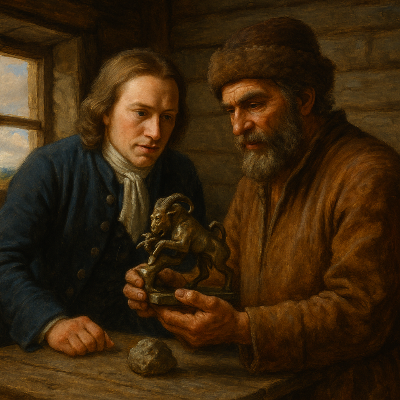 рисунок: фендрик Цоймерн и дворянин Вишневецкий в Чаусском остроге рассматривают артефакт из могильника - искусно сделанного из меди идола: козла, на которого бросается лев.