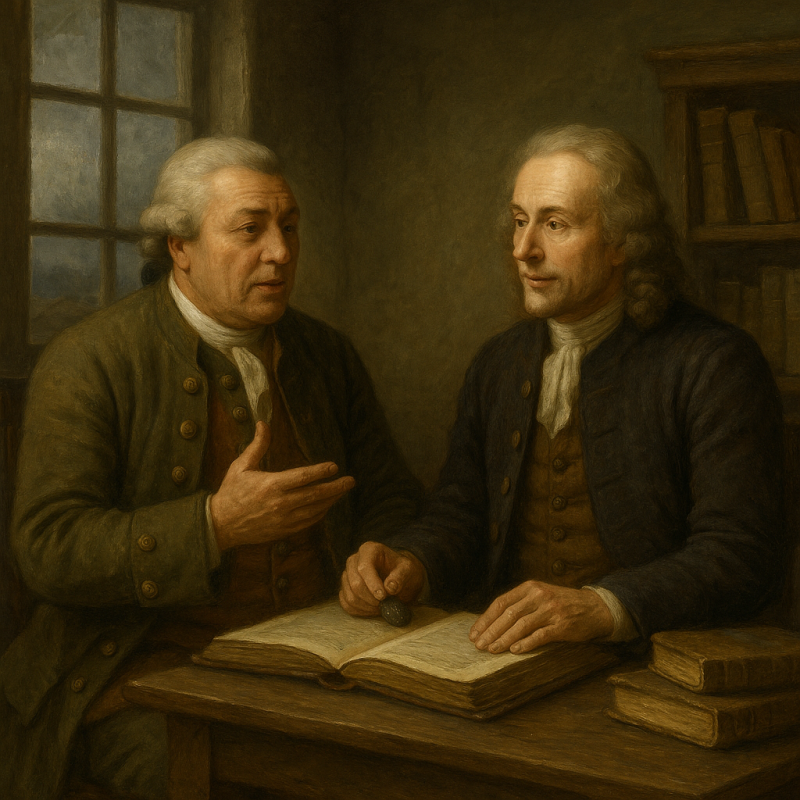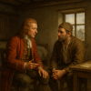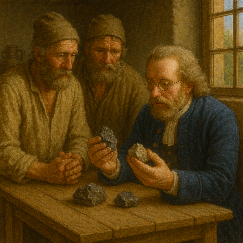 рисунок: Господин доктор беседует в своей резиденции с двумя мужиками, прибывшими от коменданта, и рассматривает два образца руды и слюдяной камень.
