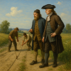 рисунок: доктор Мессершмидт и капитан Табберт наблюдают как люди измеряют расстояние на дороге при помощи верёвки. Ветер юго-восточный, погода очень ясная, летняя.