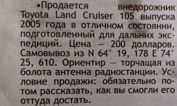 А стоимость часа вертолета который может выдернуть крузера из болота не прикидывал?Дак и стоимость затонувшего, я полагаю, не 200 т.р.![]()