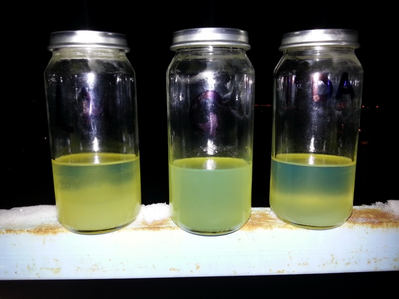 Летнюю, ну или демисезонную, налил на ННП ("G ДТ"). Сделал три пробы: просто G, G+антитигель Ликвимол, G+TDA Castrol. Когда будут морозы, гляну что получится.Как уже говорил, сделал 3 пробы по 125 грамм солярки+присадки. Поместил каждую в стеклянную банку и оставил морозится на лоджии.