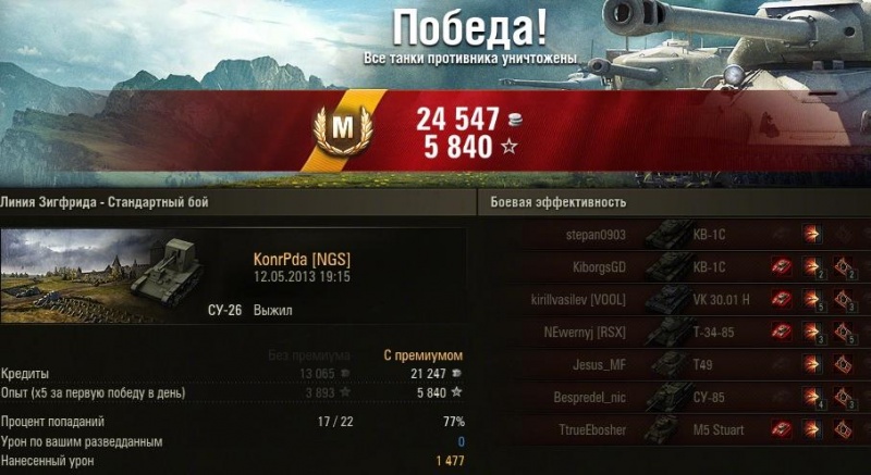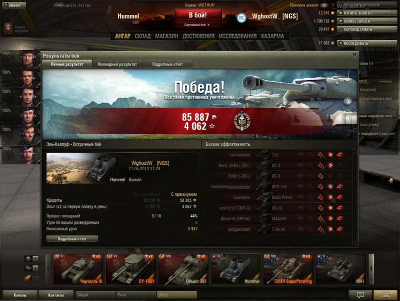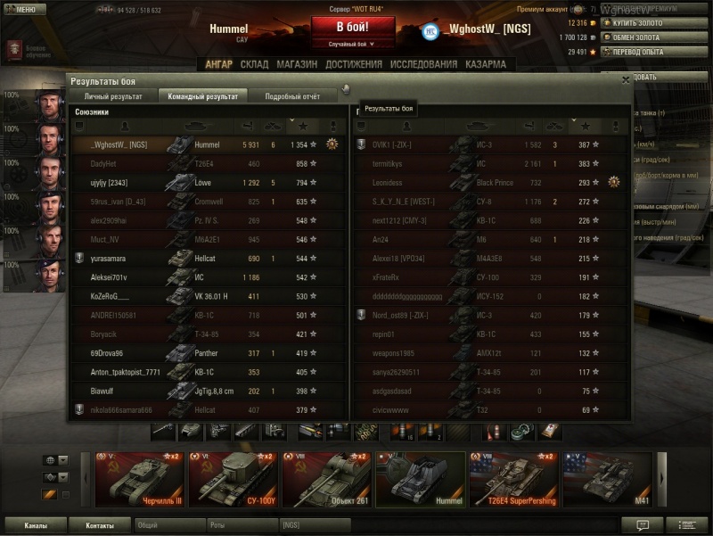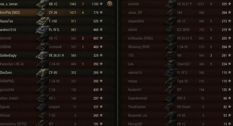 В ангаре:т-34, т-43, Ис-7, Су-8 (прокачено до об. 261), pzIII, пантера, федя (прокачен до ягтигра), М6, ELC AMX, АМХ 90.Вы нам не подходите