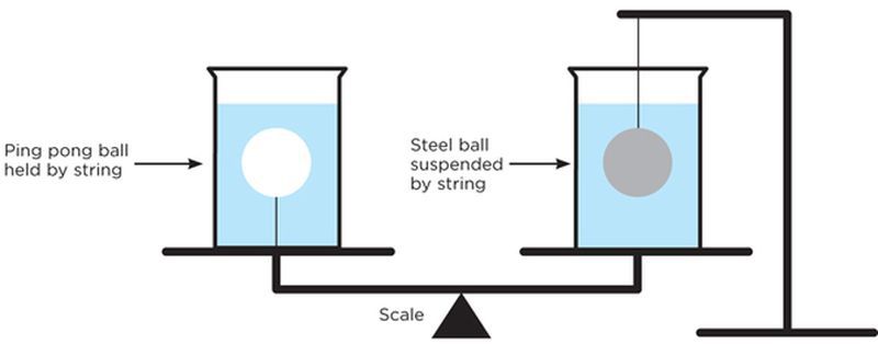 В случае с металическим шаром эффект тот же что долить воды на вытесненный объем.Кстати если после того как нить перерезать пинг понговский шарик утопить прижав чем нибудь сверху - получим вариант с металлическим шариком