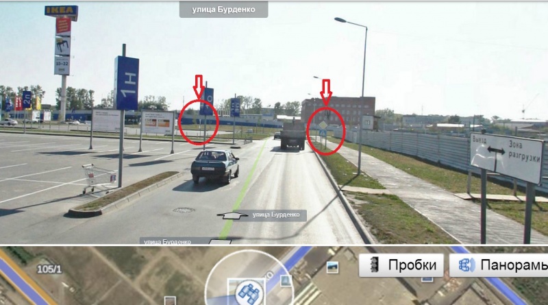 согласно ГОСТ Р-52290-2004 пункт 5.2.2 ; допускается изготавливать знаки как односторонними, так и двусторонними, а также размещать изображения знаков на щите прямоугольной формы. Так что всё сделано по ГОСТу. МЕГу заставили не только сделать мост , но и установить знаки и на наружной и на внутренней парковке, тут хоть понятно где главная дорога, а вот у ЛЕНТЫ знаки только на вьезде.а вот у роял парка и ауры не заставили, почему то и ничего стоят, мешаются всем...