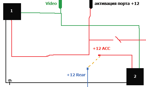 надо чтобы при подаче питания на "+12 Rear" выключалась бы "камера 1" и попадало питание на "активацию видео порта"...