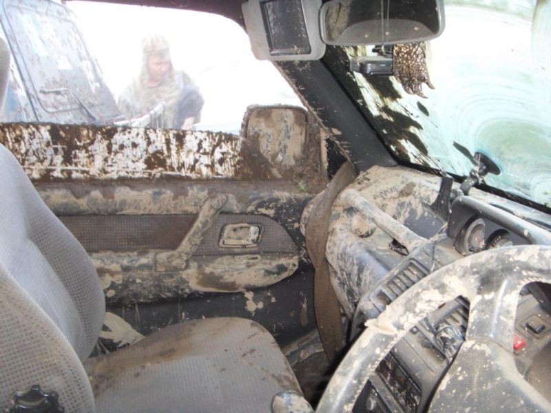 Возвращаемся оттуда и через 22-ю уходим на 47. Дорога раскисает нафиг, сверху все идет дождь. В одном месте засаживаемся хорошо так. Впереди - поле. Джек с траками не помогает. Сзади догоняет нива и обходит по кустам. Пробуем лебедиться вбок - машину начинает опрокидывать, чуть не разбортовываемся. Собираем все веревки и цепляемся за куст. Тянемся, куст вырывает (толщиной с руку был). Добавляем все стропы, что были и цепляемся за ближайшее дерево, выезжаем...