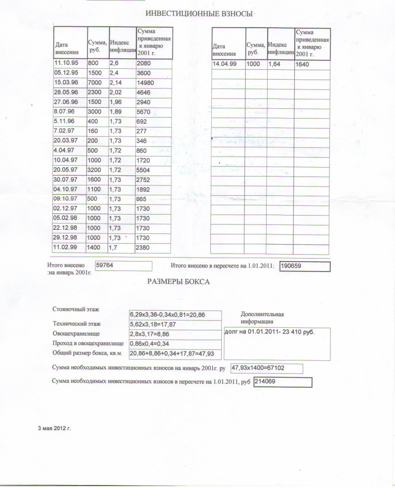 На сегодняшний день бремя ответственности за этот гараж свалилось на меня. И на первом же посещенном мной собрании (1,5 года назад) я услышал от председателя ГК, что за нами есть долг в почти 20 т.р. Я в недоумении, начинаю спрашивать, а он мне говорит, что когда-то на собрании ГК было принято решение о ПЕРЕМЕРЕ гаражей и у нас гараж оказался больше и мы должны были доплатить разницу. И нынешний долг складывается из разницы уплаченных ранее взносов с поправочными коэффициентами и "суммой необходимых инвестиционных взносов на 2001 г."