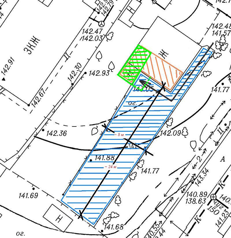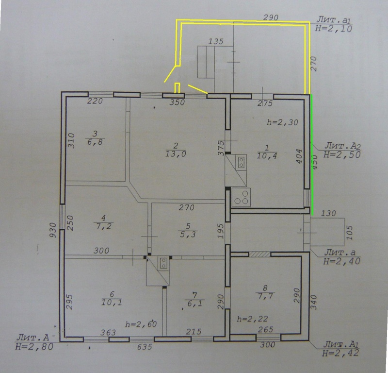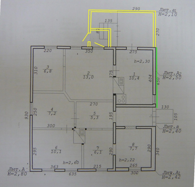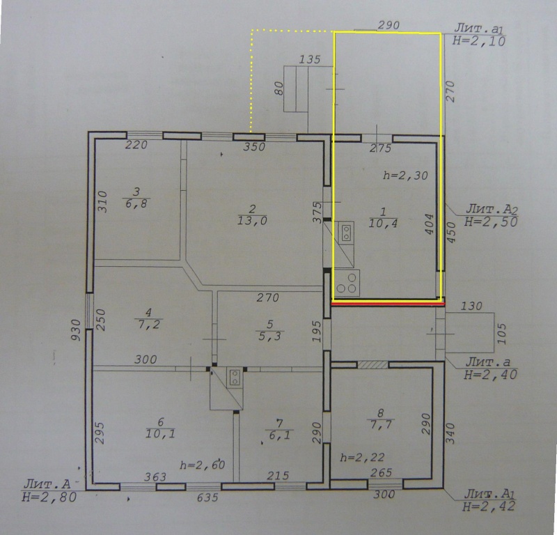 - на картинке жёлтым цветом показана площадь реконструкции, красным цветом линия, которая должна остаться незыблемой и не должна во время разбора подвергаться никаким деформациям - это чужое. Жёлтый пунктир - это возможная зона расширения пристройки;