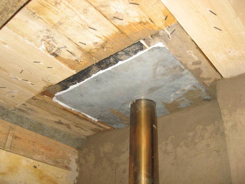 • фото 11. Ставим печь на бетонный фундамент, вокруг - кирпичные противопожарные стены. На потолке вокруг трубы лист оцинковки, доски потолка - на противопожарном расстоянии в 25 см, вокруг трубы на чердаке обёрнут асбокартон и лист жести.
