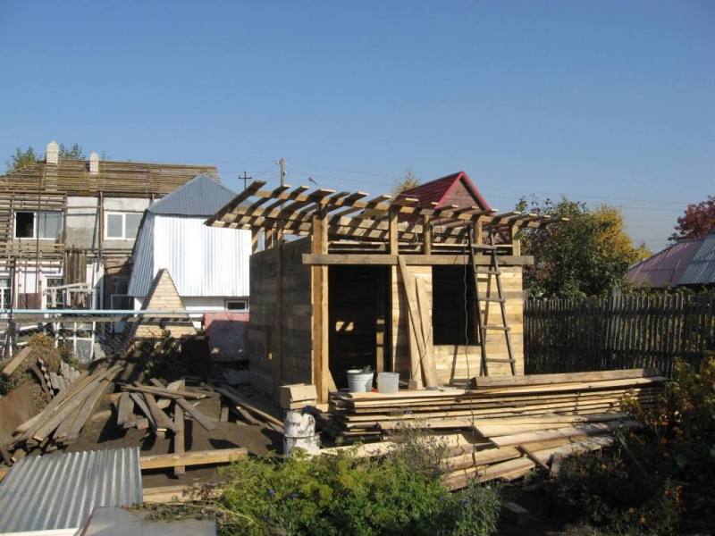Сейчас готов фундамент,каркас,слив,пол.Обшивка затянулась.Нехватка времени затягивает процесс и потому что материал самодельный - делаю доски из недогорбыля,плах,брёвен и прочего такого.