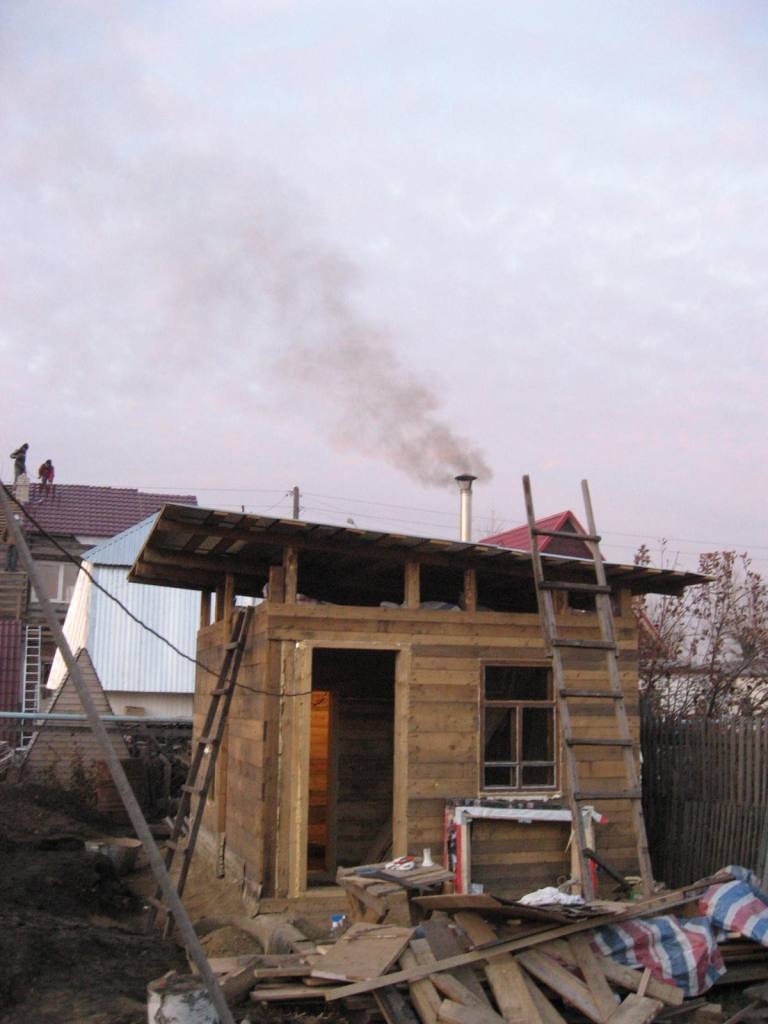 Потом сами оббили его пароветроизолом, обшили купили печь и накрыли.