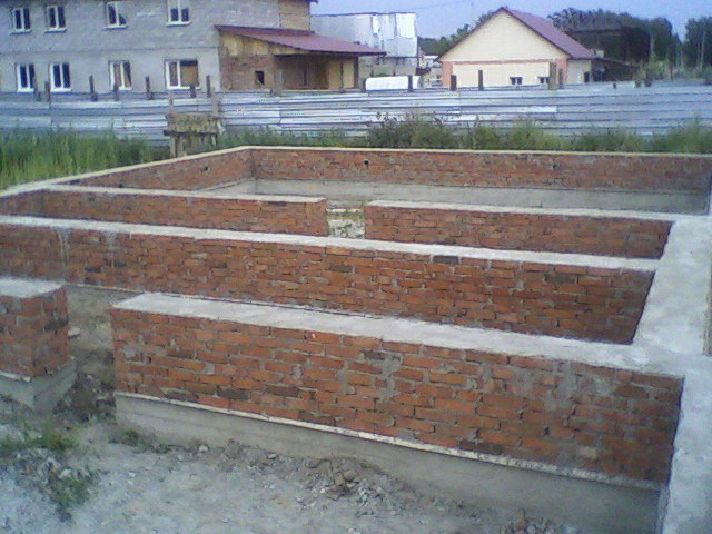 На второй год я поставил себе план максимум – поднять первый этаж и перекрыть его. Что и было с успехом сделано, а теперь обо всем по порядку. Сначала поверх фундамента был выложен кирпичный цоколь на высоту около 60 см. почему не залил из бетона вместе с фундаментом? Да потому, что из кирпича выложить его гораздо дешевле… Поверх цоколя легли плиты перекрытия, служащие основой пола и перегородок первого этажа, затем началось возведение стен.