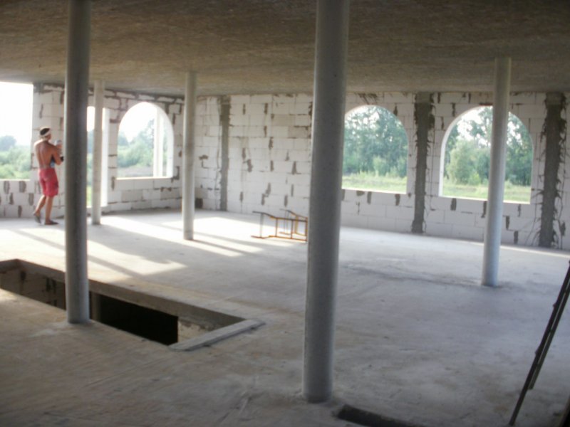 В итоге к концу лета у меня стоял первый этаж, который благополучно был перекрыт плитами перекрытия. Поверх вармита был залит армированный сейсмопояс – не для того, чтобы дом выдерживал землятресения, а тупо для того, чтобы исключить растрескивание стен, а также для того, чтобы равномерно принять нагрузку от плит перекрытия на стены.