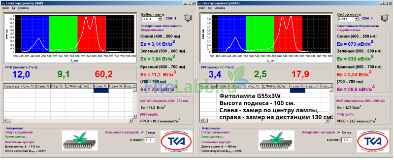 Как видим, назвать полноценной фитолампой с полным спектром G55x3W можно с натяжкой,Как понимаете речь идет о том, что в спектре нет УФ и ИК части спектра.