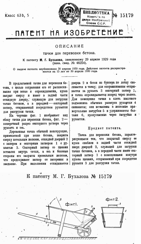 Сайт findpatent.ru не перестаёт радовать, тачка для перевозки бетона, изобретение №15179 от 1930 года, автор М.Г. Бухалов.