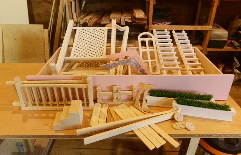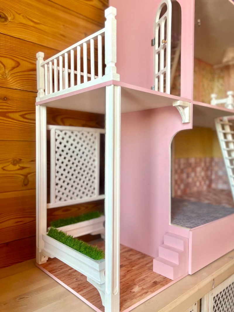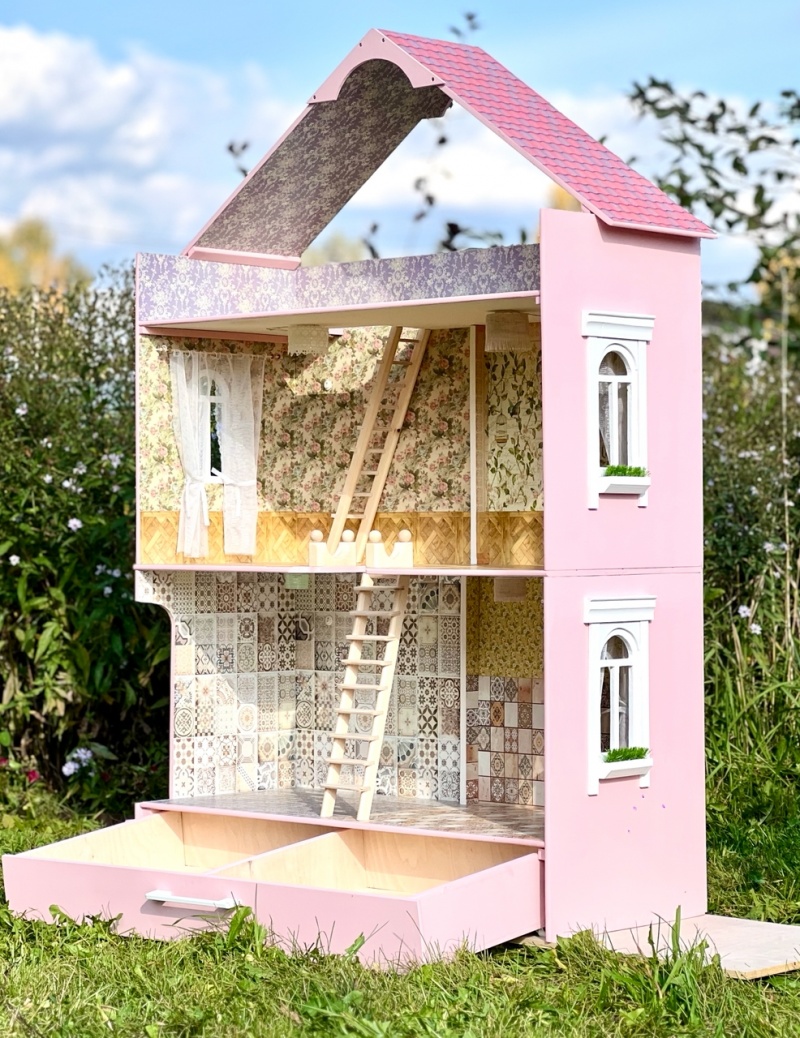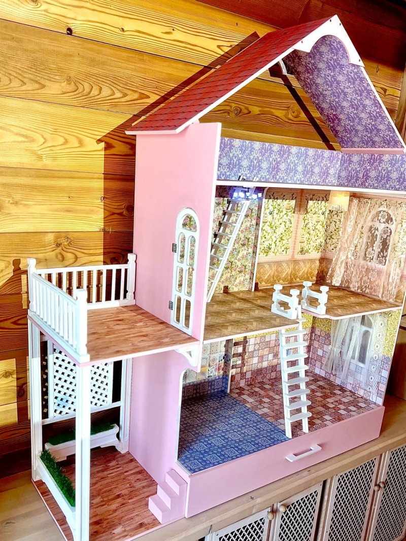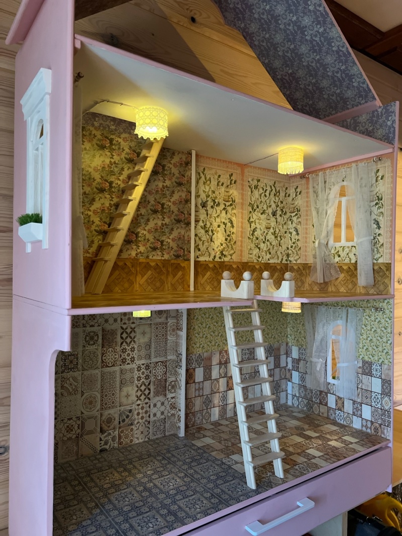 Любой кукольный домик по сути ящик. Можно собрать стены, пол и крышу и покрасить. Можно нарисовать элементы декора. А можно пойти по сложному пути - сделать в миниатюре наличники на окна, оклеить обоями, сделать светильники и освещение, сделать красивые деревянные элементы - более 40 деталей. Чтобы удобно было играть на первом этаже надо домик поднять и сделать выдвижной ящик для игрушек. Тогда может получиться большой уникальный кукольный домик для барби