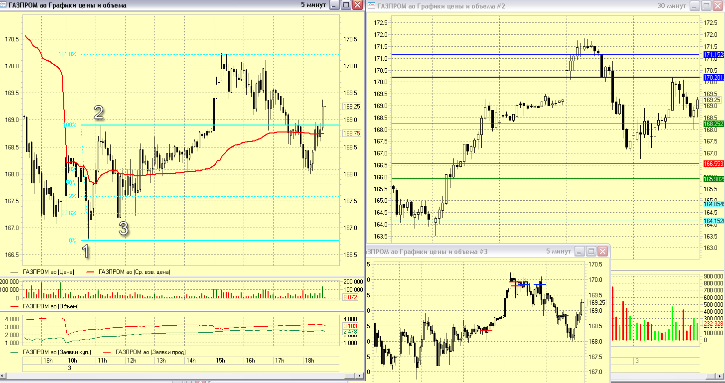 Первый получили уже на первом часе торгов. Точка "3" протестировала средневзвешенную и объемный уровень 168.25 снизу. Реализация не заставила себя долго ждать.
