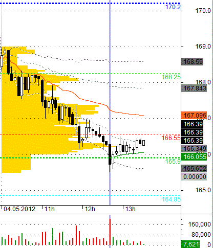 Теперь о дальнейшем движении. Считаю, что классическим бы получился откат в район 167.1, здесь находится средневзвешенная от локального экстремума 19 апреля, которую вчера пробили. На 169.09 находится средневзвешенная от хаёв 16 апреля, вчера этот уровень выступил сопротивлением, именно с ним будем бороться в ближайшее время. Дальше по нарастающей: 172.2 от 6 апреля, 173.3 от 3 апреля, 179.5 от хая 15 марта. Вот все эти уровни могут выступить разворотными точками возможного роста.