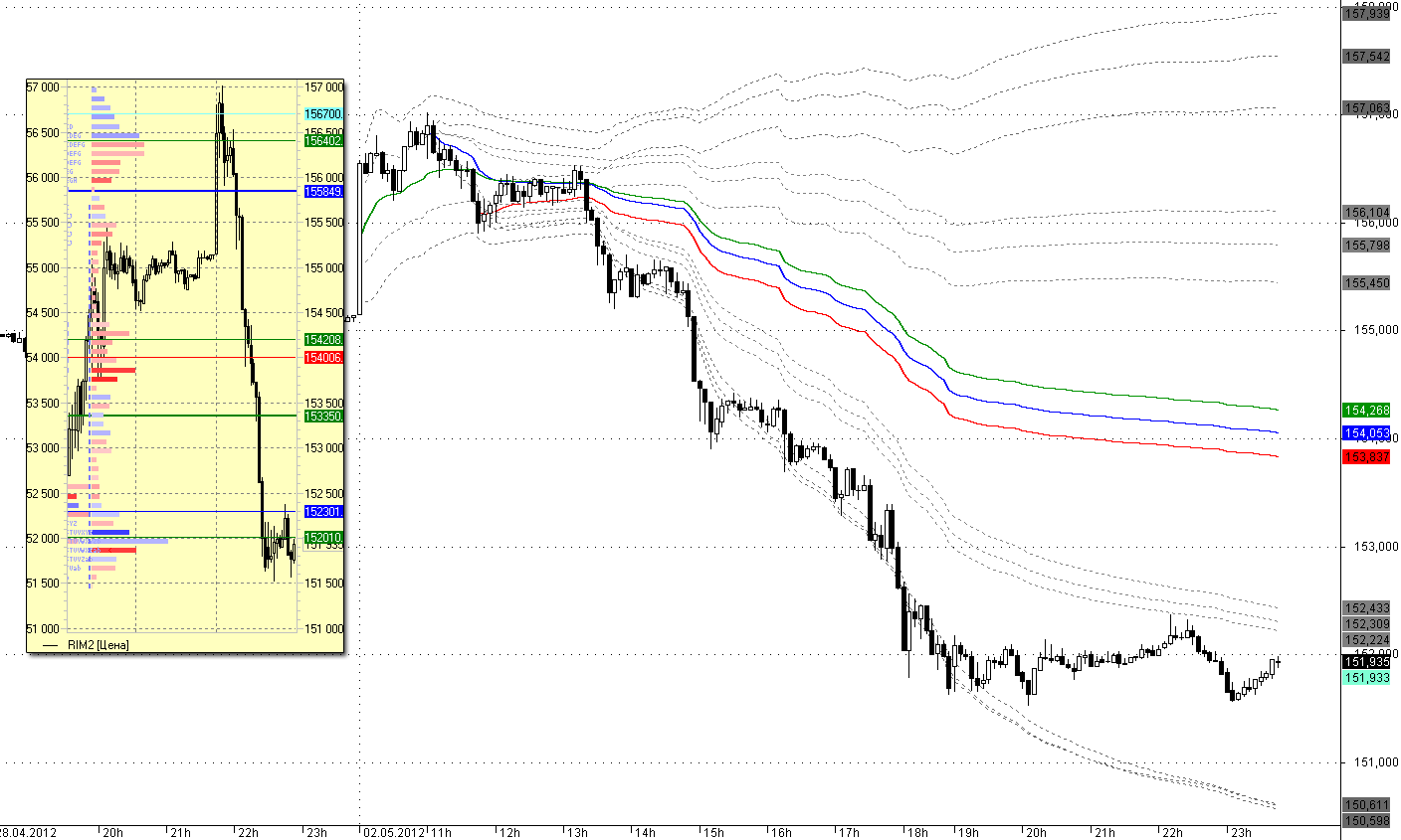 В начале торгов уровень 152300 не пустил дважды цены вверх. Стоит отметить, что данный уровень в принципе их не пустил и далее.