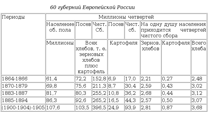 "Мы видим отсюда, что до 1890-х годов пореформенная эпоха характеризуется несомненным ростом производства как зерновых хлебов, так и картофеля. Производительность земледельческого труда повышается: во-первых, величина чистого сбора возрастает быстрее, чем величина посева (за некоторыми частичными исключениями); во-вторых, надо принять во внимание, что доля населения, занятого земледельческим производством, за указанное время постоянно уменьшалась вследствие отвлечения населения от сельского хозяйства к торговле и промышленности, а равно и вследствие выселения крестьян за пределы Евр. России." Особенно замечателен тот факт, что растет именно торговое земледелие: увеличивается количество собираемого (за вычетом семян) хлеба по расчету на 1 душу населения, а внутри этого населения идет все дальше и дальше разделение общественного труда; увеличивается торгово-промышленное население; земледельческое население раскалывается на сельских предпринимателей и сельский пролетариат; растет специализация самого земледелия, так что количество производимого на продажу хлеба возрастает несравненно быстрее, чем все количество производимого страною хлеба". - Как видите, автор отмечает уверенный рост производства сельскохозяйственной продукции, при том, что сельское население перетекает в торговлю и промышленность, что свидетельствует как раз о динамичном развитии РИ, а не об упадке и отставании.