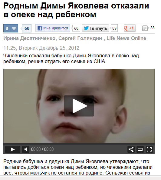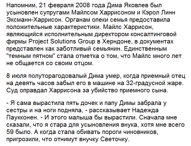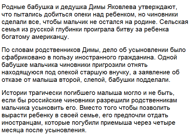 Родным Димы Яковлева отказали в опеке над ребёнком . http://lifenews.ru/news/108813я знаю, что его мать отказалась от старшей дочери в роддоме. И от Димы она отказалась в роддоме. Причем бабушка (те самые "родные") позиционируется как "нормальный человек".