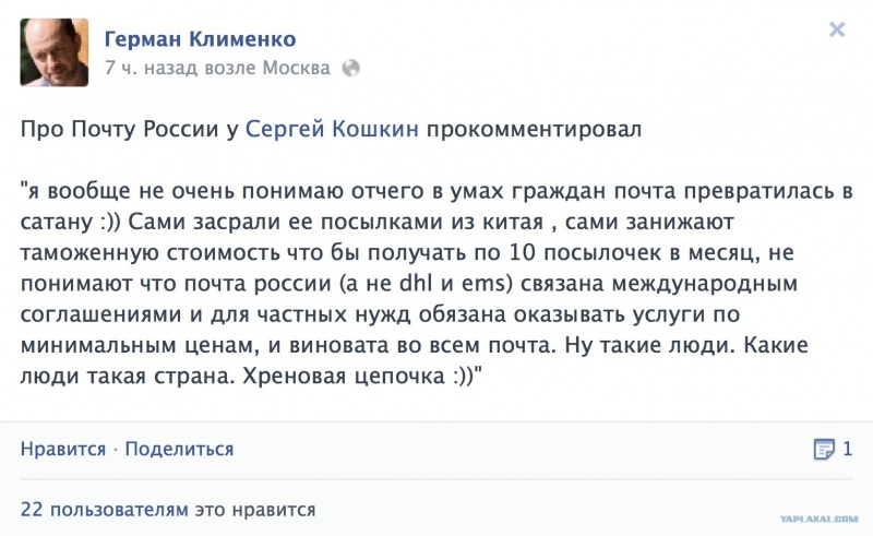 ПС Самое интересное - что все стоят, смотрят, видео снимают и ржут "Вот так почта доставляет нам почту - почта россии" и ни один (из сторонних зрителей или перонных работников) не осмелился подойти и сказать, "вы что ох....ли?"для начала пусть так, спасибо добрым людям за это хотя бы.