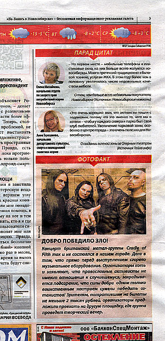 А вот это уже на самом деле не смешно. На страницах "Ва-банка" совершенно безапелляционно Крэдлов обозвали сатанистами, а православных экстремистов - носителями добра. Коль скоро "Ва-банк" - это обычная бесплатная газетка (то бишь, рекламное издание, в котором ни одна буква не печатается за спасибо), значит, этот материал кем-то проспонсирован. А раз находятся люди, кому не жалко тратить деньги (не свои, естественно, а скорее всего бюджетные - то есть наши с вами) на подобные жупелы, то это действительно дело дрянь.