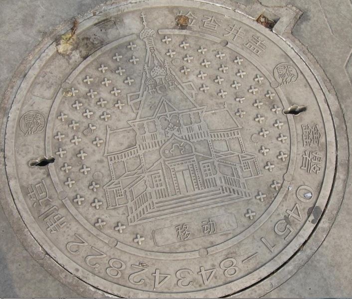 Знакомый сейчас работает в университете в г.Харбин, где с большим пиететом относятся к православию, церквям и так далее. И прислал он оттуда фотографию люка (на которые местные русские прихожане ни коим образом не ругаются и не скандалят!) По-моему это изображение одной из церквей, расположенных на территории Харбина.