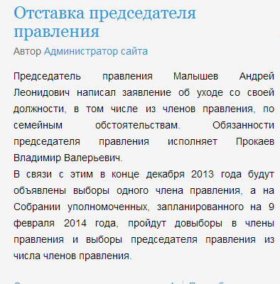 Если вы не в курсе Малышев не куда не уходил, у человека случились определенные семейные трудности, по этому он написал заявление на увольнение с председателя, но из правления он не куда не уходил.Дайте, пожалуйста, телефон Малышева. Или другой электронный контакт. Хотелось бы узнать почему он не появляется на правлении.