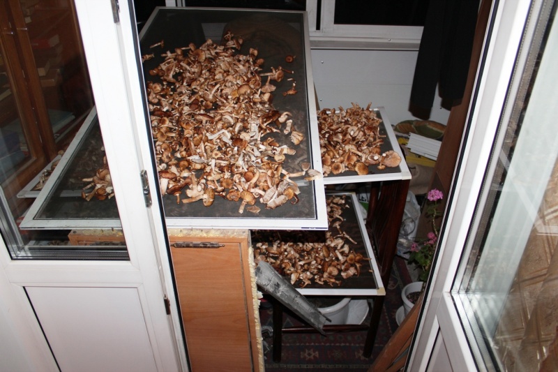 Куда проще тоненько-тоненько грибы на пластики порезать (я это томограммой называю) и на противни разложить. Пока сухо, они за пару дней хоть на балконе, хоть на кухне свернутся и подсохнут.