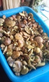 А так по мелочи. За два часа бега по околкам: лисички, черный и мокрый груздь, лисички, волнушки, белый, подберезовик и подосиновик...Из последних трех спасти удалось только ножки..шляпок - почти не удалось. Вроде махонькие, а уже червивые и с личинками..Итого два ведра без верха.