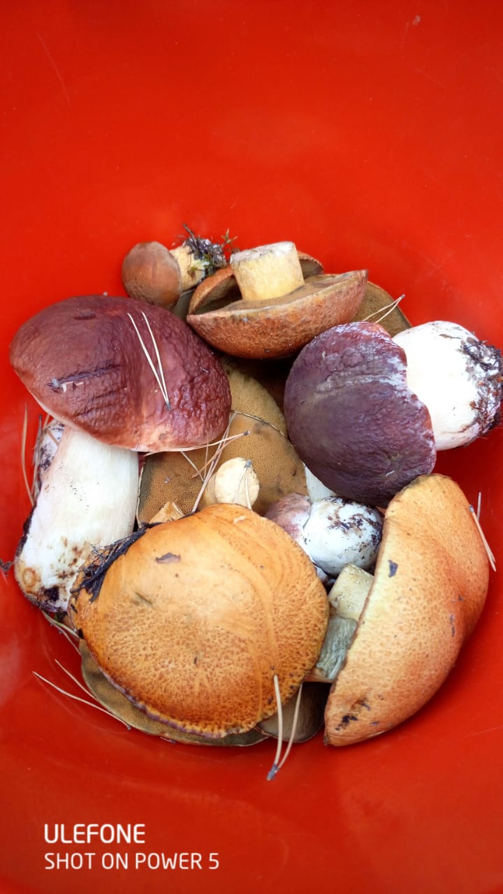 За 5 часов вдвоем собрали ведро боровика и чуть больше ведра моховиков и маслят. Встречались грузди и рыжики, совсем немного.