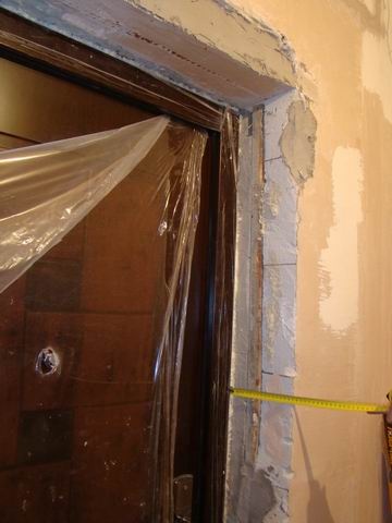 Если у вас есть локальные выбоины в дверном проеме, то лучше всего вырезать по размеру отрезки гипсокартона, посадить его на гипсовую шпатлевку и получите ровную поверхность. Или уж штукатуркой или Скалой в несколько слоев выводите поверхность.