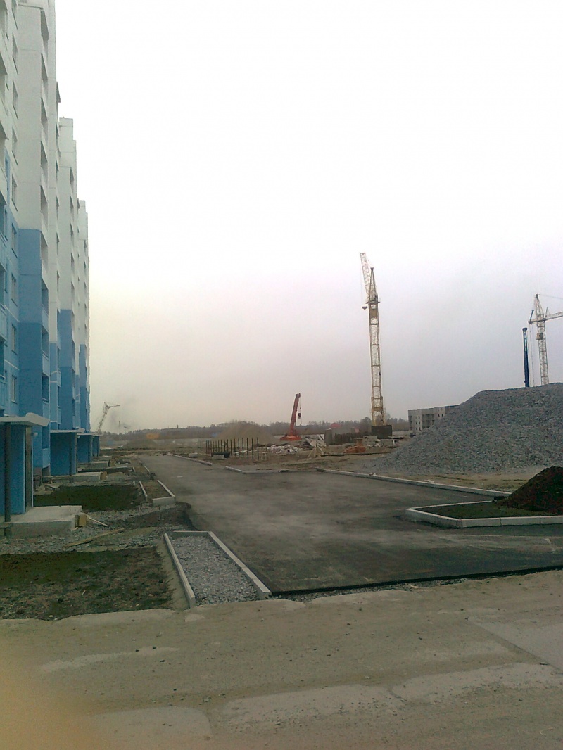 У полей что-то типо дороги, не асфальт, а плиты, но считается дорогой. Может скоро и ее заасфальтируют. 10 стр. так и не доделали тех этаж в конце дома, но там немного уже осталось. Обратите внимание на приписку снизу вывески, эта вывеска на одном из подъездов ЧС-2, может там будут ключи выдавать.......