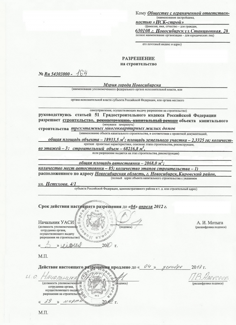 Пять участков оформлены на ООО НСК-Недвижимость - типа Застройщик. ООО НСК-Строй - типа ген.подрядчикМутно как-то получается. Разрешение на строительство выдается только "застройщику" (см. ГрадК РФ)...