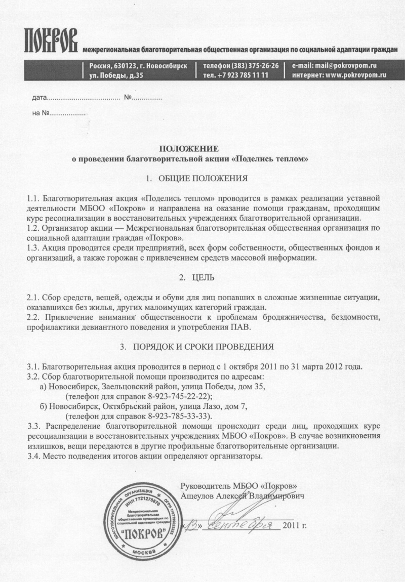 С 1 октября, в преддверие надвигающегося холодного времени года, межрегиональная благотворительная общественная организация «Покров» объявляет о начале акции «Поделись теплом!» по сбору тёплых вещей и одежды для малообеспеченных категорий граждан, и в первую очередь для тех, кто обратился в восстановительные учреждения нашей организации.