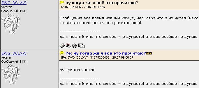 Неплохо помогает при возникновении такой проблемы, просто перелогиниться (при чем надолго хватает)Надолгого - это часа на два-три максимум. Проверено неоднократно. Дольше этого времени без перелогинивания не удавалось наблюдать нормальную работу пометки прочитанных/непрочитанных сообщений уже несколько месяцев. Если сидеть в течении дня продолжительное время на форуме, то перелогиниваться приходится раза три-четыре, потом просто надоедает, и форум посылается куда подальше.![]()
