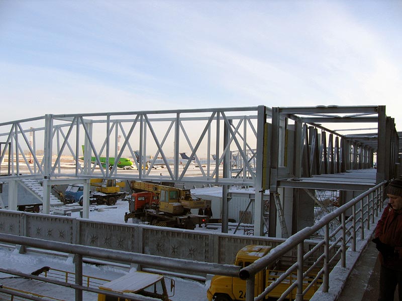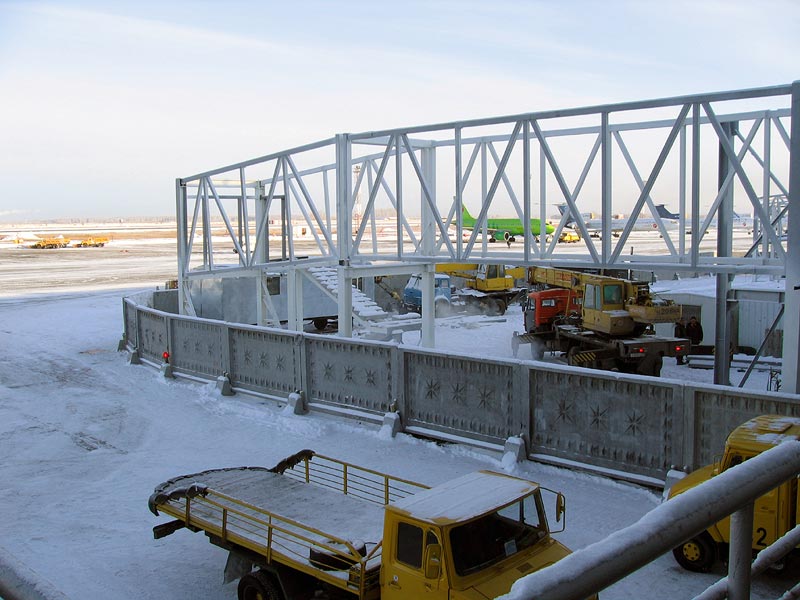 Строящиеся телетрапы. Находятся примерно у выходов 5 и 7, но если посмотреть внимательно, то уровень пола у них выше уровня зала на втором этаже и есть некий коридор за балконом аэровокзала, с которого обычно спускаются к автобусу.