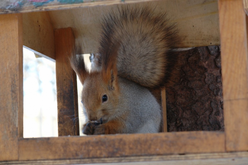 В общем, еще с того года (раньше там мало гуляли) заметили что в начале зимы все белки попросту исчезли, а бабушки все говорили что они в зоопарк убегают. Тогда уже понимал, что это ерунда полная. Кто же от полных кормушек и своего дома убежит. Но именно эта версия и ходит среди посетителей до сих пор. (
