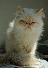 У dink на передержке и лечении находится кот, светлый перс. Он очень истощён, у него ушной клещ, да ещё и выколот глаз.