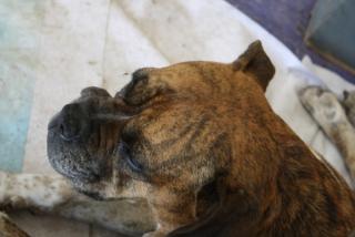 "Ребята, огромная просьба - помогите животному. Собаку зовут НАЙДА - боксер, прибилась к нам на аэродром, за этот год у нас на аэродроме жестокие люди бросили двух собак. Найда третья, остальных собак пристроили своими силами, но Найда собака, мягко говоря, не молодая и судьба у нее сложная. После осмотра ветеринар сказал, что собака чистокровная и использовалась только ради породистого потомства, а когда собака состарилась и уже не могла рожать, её выкинули на улицу. Собака очень умная, добрая и ласковая, все понимает. К сожалению, сама я её не могу приютить, т.к. работаю инструктором-парашютистом и часто уезжаю из дома, а с собакой надо гулять.