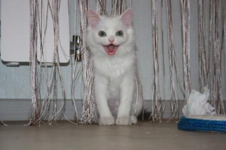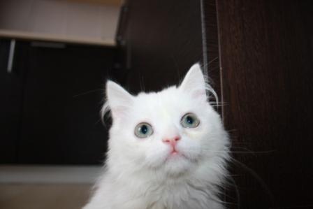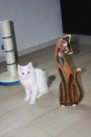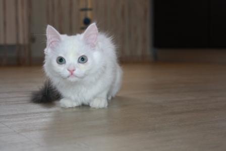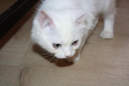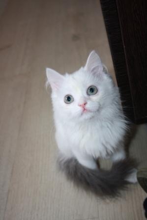 Теперь насчет экстерьера - когда-то там бегали персы, пушистая, шерсть по качеству очень персидская, мордаха ближе к персо-классике, сама вся белая, а хвост как-будто от другой кошки - явно от какой-то дворовой Мурки пришили