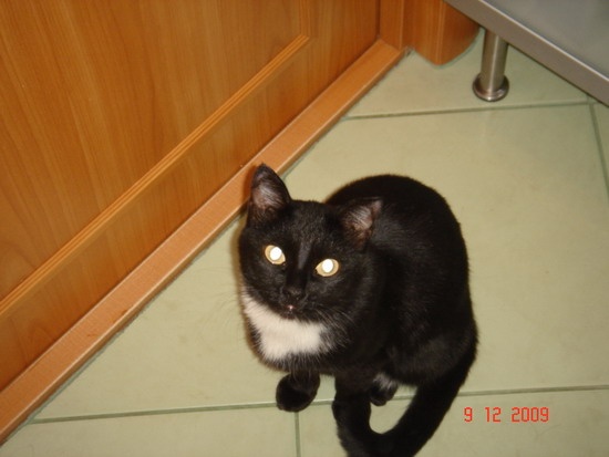 Кошка появилась в подъезде 7 декабря, черная с белой манишкой на груди, с большими желто-зелеными глазами.
