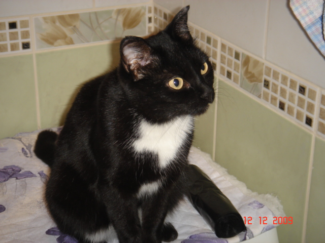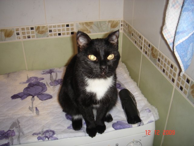 Кошка появилась в подъезде 7 декабря, черная с белой манишкой на груди, с большими желто-зелеными глазами.